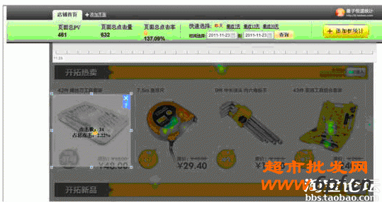 目前量子恒道統計工具新出的裝修熱圖也是一個很好數據分析工具。如果到達首頁的流量不錯,那么完全可以把需要驗證的圖放在首頁的某個醒目位置,在次日觀察數據情況。如果想做對比分析,那么可以把需要做測試的主圖放在同一個區域,這樣就可以很好的鑒別出哪個寶貝圖更加吸引人。
