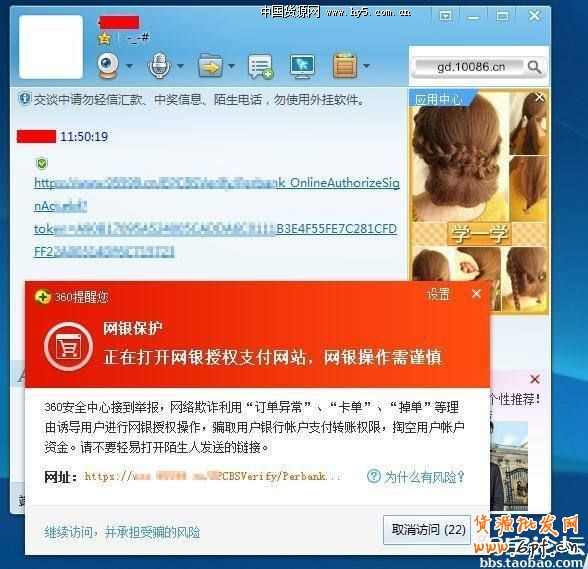 不過(guò),由于近期與授權(quán)支付相關(guān)的欺詐案件連續(xù)發(fā)生,而且涉案金額巨大,受害者大多損失慘重,因此,360互聯(lián)網(wǎng)安全中心特別調(diào)整了防護(hù)策略,針對(duì)來(lái)自即時(shí)通信工具中的授權(quán)支付鏈接進(jìn)行風(fēng)險(xiǎn)提示,如下圖: