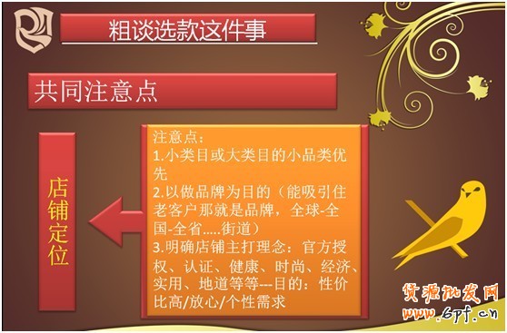 產品是組成店鋪的關鍵因素,也是我們將選款的主角,因此必須要從“根源”上把握好定位,當然我們我們不可能想最全,所以我們要從小做起,以點帶面,以做精做專為立足點,所以,選要注意以下幾點: