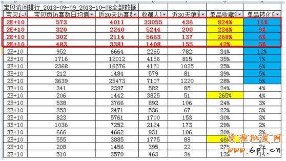得出數據后,我們要進行自定義篩選,這里可以介紹大家一種小編自創的方法(標色篩選法),首先我們自定義每一項數據的“門檻”,如:收藏率>=40%,轉化率>=5%,進行兩種顏色進行篩選重疊,取重疊部分,這樣既保證收藏又保證轉化,我們看一下結果: