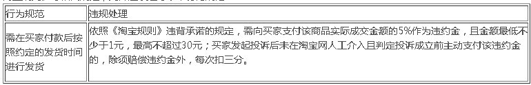 為解決無貨空掛情況,淘寶規則要求淘寶實物商品默認付款后72小時內發貨(另行約定特殊情況除外),未按約定時間發貨將向買家支付該商品實際成交金額的百分之五作為違約金,且金額最低不少于一元,最高不超過三十元;買家發起投訴后賣家在淘寶網人工介入且判定投訴成立前,未主動支付該違約金的,除須賠償違約金外,每次扣三分;