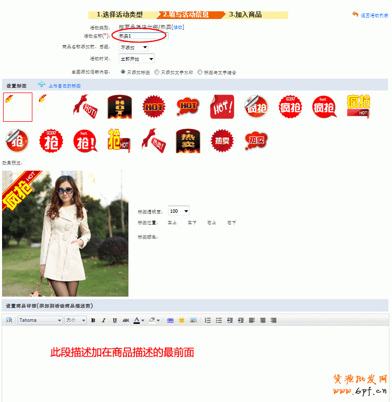 在這一步,您可以為您的促銷商品添加水印,還可以為商品描述增加一個短促銷信息。