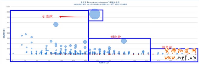 豎軸y軸:銷售件數(shù);橫軸x軸:價(jià)位;x軸為商品折扣單價(jià),y軸為近30天銷量,每個(gè)圓圈代表一個(gè)寶貝,面積為30天銷售額;圈圈越大說(shuō)明最大銷售越大。圖中可得,裂帛服飾旗艦店主打100-200元;引流款:50-150;利潤(rùn)款:150-300;形象款:300-850。