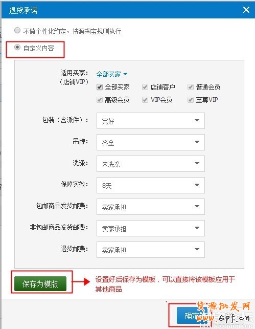 (4)點(diǎn)擊“自定義內(nèi)容”后根據(jù)約定內(nèi)容設(shè)置,設(shè)定好之后可以將其保存為模板,給其他商品直接做同樣的配置。