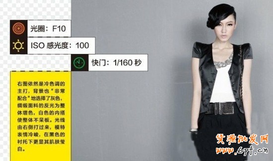 攝影師對(duì)此片運(yùn)用了主光由左側(cè)打向模特,產(chǎn)生陰影,使得模特整體感更顯苗條。攝影最講究的是光線的運(yùn)用,所以,在正式拍攝前可以拍一些“撥拉片”來(lái)對(duì)光線進(jìn)行調(diào)整。比較之下,棚拍要比一般的攝影難,難就難在對(duì)光線的控制,因?yàn)閿z影棚里拍攝快門(mén)一按,就會(huì)出現(xiàn)燈光的影閃,拍出來(lái)的照片要不太暗,要不太亮。