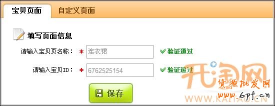 3. 現在我們先來添加一個“寶貝頁面”,輸入要添加的“寶貝頁名稱”和“寶貝頁ID”,點擊“保存“。