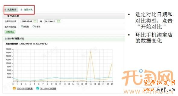 2、“按天流量分析”提供手機(jī)淘寶店鋪wap&客戶端訪問(wèn)的流量數(shù)據(jù):分天的流量趨勢(shì)&流量對(duì)比數(shù)據(jù)。