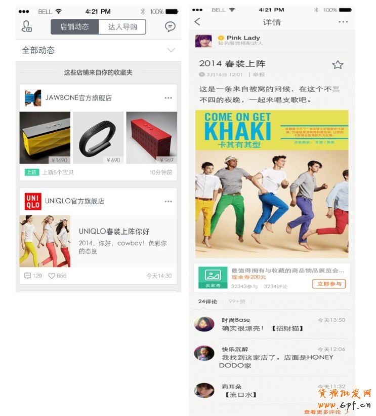 2. 微淘動態新增店鋪活動,互動型導購優化:這是手機淘寶商家店鋪賬號與用戶的動態消息互動 ,是一種 基于收藏關系的營銷方式。手機淘寶在今年6月最新版本中已經把商家原來PC 端的收藏關系與原微淘賬號的關注關系打通,合并去重后的海量忠實客戶和粉絲等匯聚在商家手機淘寶無線店鋪賬號中,更便捷且有效的進行兩者關系的維系和增強。這次版本升級后, 微淘的內容將更加結構化。除了店鋪優惠、上新等信息,更多的互動活動已經可以加入進來,如買家秀、投票、搶購以及試用等,可以在微淘店鋪動態中透出。