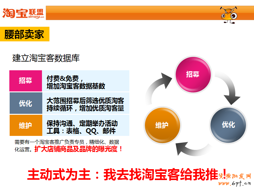 我們腰部賣家除了前面中小賣家做的方法之外,更要用心做的是淘寶客的運營方面。比如主要的運作流程分為三個。招募丶優化丶維護。讓自己店鋪建議一個淘寶客數據庫,并優化及完善。因為這種操作方法時間越久合作的淘寶客及可篩選出來的優質給力淘寶客數會越來越多,并且維護工作做到位我們對于淘寶客的可控性會更強。對店鋪有了臨時或者計劃性的活動的時候可以發揮出爆發性的效果。