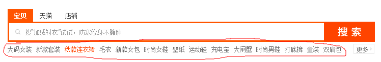 首先是淘寶首頁搜索框底下的小字,它會經(jīng)常更新,那里面可能就有你要的神詞。點擊更多按鈕還會出現(xiàn)“今日關(guān)注上升”和“一周入門關(guān)注”詞,那里也是神詞頻繁出現(xiàn)的地段。
