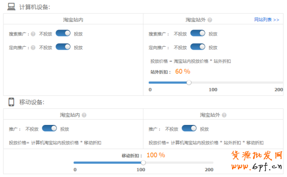 b、PC端設(shè)備投放半關(guān)閉,只關(guān)閉淘寶站內(nèi),開啟站外+無線模式,點擊成本低,點擊單價高的的情況可實現(xiàn)低價引流策略,建議賣家在熟悉操作技巧之后再進行嘗試;