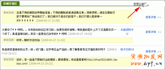 登錄店鋪首頁,找到店鋪交流區,右上角上點擊“管理全部帖子”;