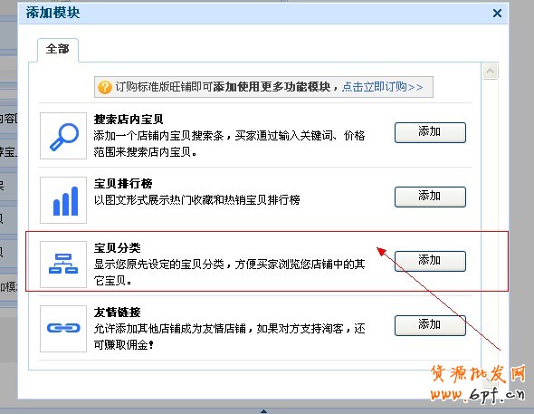 (2)在彈出頁面的左側你會發現沒有寶貝分類顯示的選項,點擊下面紅色框標注里箭頭指向的“添加模塊”添加寶貝分類。