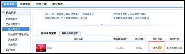 1、在“競拍中的寶貝”選項(xiàng)查看進(jìn)行中的拍賣商品您的出價(jià)狀態(tài)。