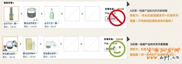 所以建議寶貝內頁的關聯銷售最好是同系列間的關聯,而組合寶貝的關聯銷售則是與其適合人群相同的其他類單個產品或組合的關聯銷售。如美白補水面部套裝對應的關聯銷售為美白浴鹽、美白面膜,而不能選擇清爽控油面部套裝或緊致套裝,因為買家已經根據專題頁面的推薦選擇美白這一關鍵詞,說明其需求是美白,所以在這里推薦其他的都是不合適的。