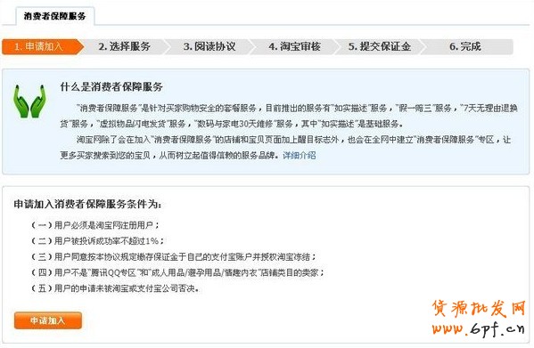 2、在申請(qǐng)加入之前請(qǐng)先確認(rèn)自己是否符合加入消費(fèi)者保障服務(wù)的條件,如果符合申請(qǐng)要求,您可以點(diǎn)擊“申請(qǐng)加入”按鈕提交申請(qǐng)。