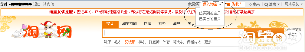 第五步:鼠標點到我的淘寶后會出現下拉菜單內容分別是已買到的寶貝和已賣出的寶貝,點擊選擇前者已買到的寶貝,或者直接點擊我的淘寶也可以