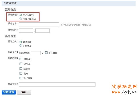如果您有開通官方網(wǎng)店,那么會在活動店鋪選擇中看到兩個店鋪,一個為淘寶商城店鋪,一個為官方網(wǎng)店。兩者在設(shè)置上的唯一區(qū)別是,若選擇官方網(wǎng)店,則“優(yōu)惠內(nèi)容”中不會出現(xiàn)“送積分”選項,積分是商城獨有的。活動設(shè)置一旦完成,不能對活動店鋪進行修改。
