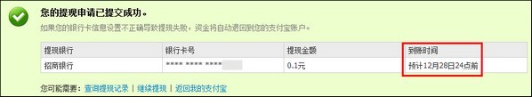 注意:申請提現之后,您可在申請提現成功的頁面上查詢款項到賬的時間: