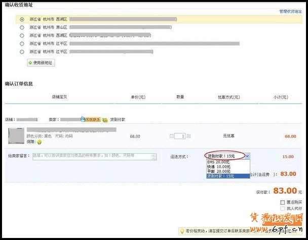 確認收貨地址、購買數量等信息,選擇運送方式為“貨到付款”即,系統會提示您選擇貨到付款運送的價格(快遞費加服務費的總和)。