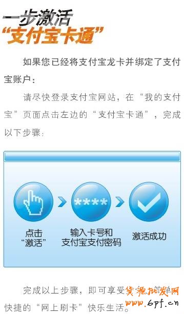 3,登陸支付寶網站,完成“我的支付寶”激活步驟:我的支付寶---支付寶卡通(頁面左邊)----點擊激活----輸入卡號和支付寶支付密碼----激活完成;