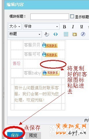 1選擇方格—2填寫文字信息—3選擇E客服分流與否—4生成網(wǎng)頁代碼—5復制E客服旺旺圖標—6粘貼到我的店鋪模塊中發(fā)布即可。如下圖:“