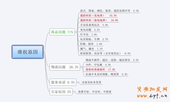 瞧,抽樣的結果果然印證了我們剛才的數據結果,我們可以看到商品問題占了退款抽樣高達71%!!而仔細一看,有七成集中在遙控類玩具上!而緊隨其后就是由于物流產生的破損,也達到了17%。(遙控類的玩具指遙控飛機/直升機、遙控賽車等)
