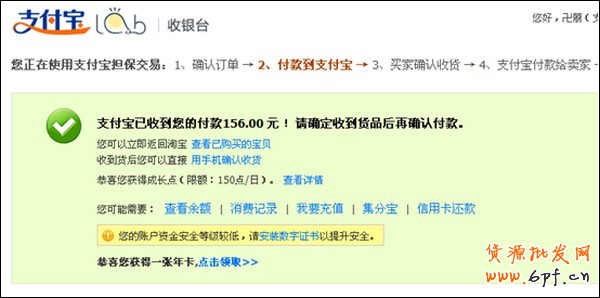 3、付款成功,同時交行信用卡快捷支付方式已開通,下次付款時只需輸入支付密碼即可完成付款。