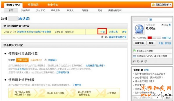 1、登錄支付寶賬戶,找到需要付款的交易(該筆交易支持信用卡支付),點擊【付款】或者從淘寶購物進入收銀臺;