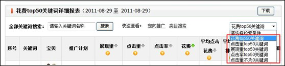 查看直通車首頁“基礎(chǔ)數(shù)據(jù)”中“關(guān)鍵詞報(bào)表”,根據(jù)您的時(shí)間,確定時(shí)間段,選擇“點(diǎn)擊量不為0的關(guān)鍵詞”進(jìn)行下載,得到賬戶所有有點(diǎn)擊的關(guān)鍵詞。
