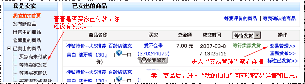 相信自己,一定有生意上門。這時候,你需要穩住氣。當別人拍下你的東西。(系統和QQ都會有消息提示哦)你這時候要告訴他。你已經收到他的購買信息。當他付款到“財付通”,拍拍會提示你發貨,你可以通過交易管理網頁看到他的地址。作為優秀賣家。你可以QQ確認一下。然后把東西按照買家選擇的郵寄方式郵出。當然,你第一個客戶。你可以留一個小紙條感謝一下。。。過些天,你可以詢問買家是否收到,當買家收到貨物你可以提醒他確認。這時候就可以評價了。互相給一個好評。你這時候已經成為一個賣家。