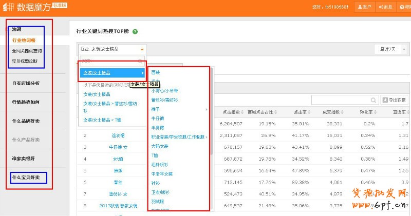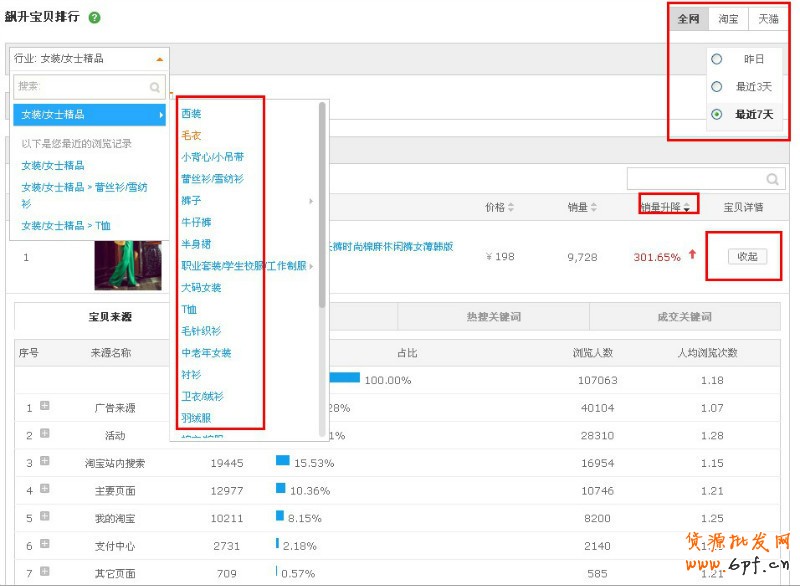 還是一樣,熱銷排行有可能是刷出來的,但如果是飆升的話刷的概率就小很多。所以,我們可以看看我們相應的類目下有哪些熱賣的產品,以及該寶貝的流量來源。