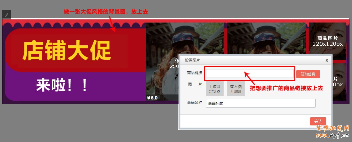 Step2:編輯投放內容,點“彩虹系統”進入編輯內容的界面,做一張11月11日·淘寶嘉年華風格的圖,添加至背景,再把商品鏈接添加進去,即可。如圖: