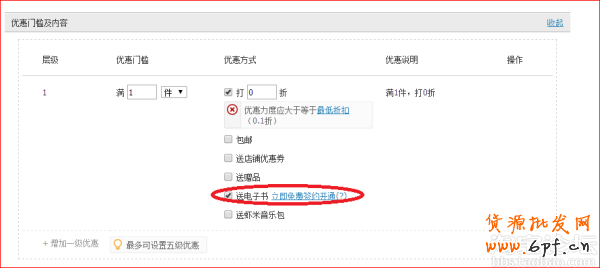 在設置店鋪活動的時候,勾選“送電子書”,如下圖所示,如果你是第一次使用該功能,則需要你先免費簽約開通: