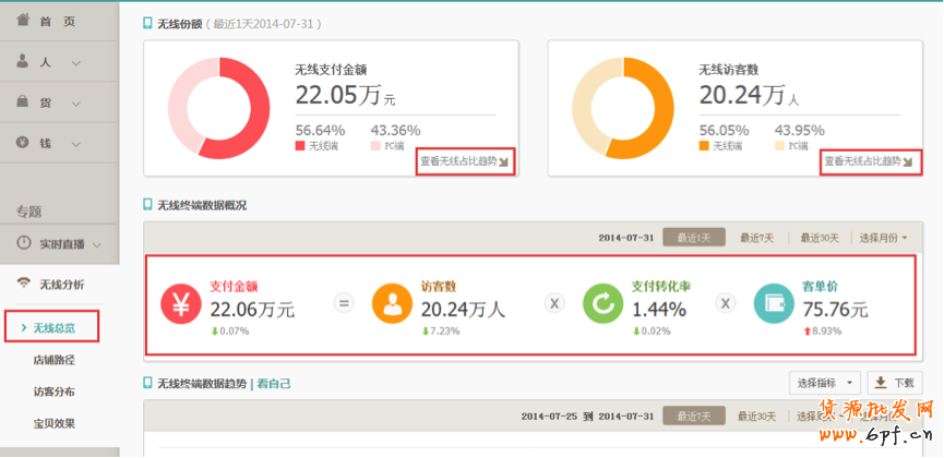1、無線端對店鋪整體的貢獻度——【生意參謀】<<無線分析<<無線總覽提供店鋪無線的訪客數、支付金額及占比趨勢,并提供看自己趨勢圖、看同行平均&同行優秀對比趨勢,讓您了解店鋪無線的一個整體概況)
