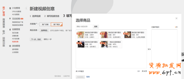 B 推廣商品:選擇商品(一支視頻可放置5樣寶貝)