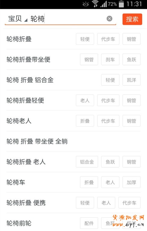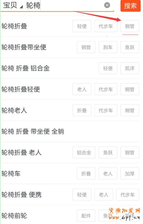 當我們搜索輪椅,看到了主關鍵詞和下拉關鍵詞和標簽詞,現在我們點擊一個進去:搜索輪椅。點擊輪椅折疊這個下拉詞的鋼管,進入:
