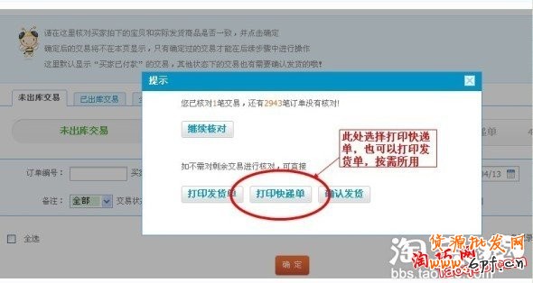 確認買家信息之后,出現“提示”,賣家可以根據提示進行打印發貨單,或者打印快遞單,或者再繼續核對及確認發貨等幾項。此處咱點擊打印快遞單。