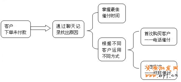 對(duì)每一筆下單后未付款的交易記錄,賣家都要進(jìn)行合理分析,推測(cè)客戶行為產(chǎn)生的根本原因。一般情況下,可以先查看客戶是否與客服進(jìn)行過旺旺溝通,如果有就翻出聊天記錄,從中可以讀出客戶的心。而未付款的原因大多也集中在以下幾個(gè)方面:產(chǎn)品拍錯(cuò)了,產(chǎn)品價(jià)格偏高,贈(zèng)品偏少,支付寶金額不足,因?yàn)槠渌蛲浉犊盍恕U页稣嬲颍侥軐?duì)癥下藥。