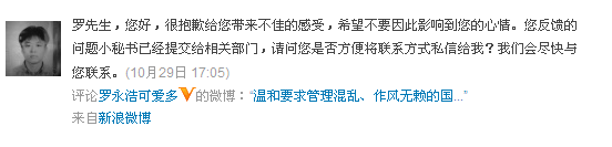 時(shí)刻5:2012年10月30日,@國(guó)航小秘書(shū) 在羅永浩投訴微博下再次評(píng)論留言: