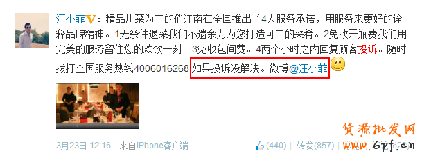 俏江南集團(tuán)總裁汪小菲重視客服,在微博上請(qǐng)顧客“如果投訴沒(méi)解決。微博@汪小菲”