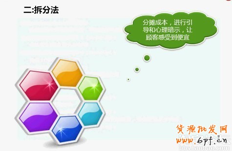 有一些產(chǎn)品的特點是可以拆分來的,比如一些藥品、保健品拆分到每天,或者我們一個產(chǎn)品使用年限長拆分到?jīng)]一年,這都是一種拆分法,通過拆分價格分?jǐn)偟狡骄臅r間段讓顧客感覺到每天、每月、每年使用的價格是非常的便宜。這里也是有個顧客想買保健品,但覺得價位高了,一套要700多呢,顧客也說可以少買兩件,我們當(dāng)然說可以啦,我們要一定要順著買家的思路和語言來來說,我們要說顧客想聽的話。隨后我們又轉(zhuǎn)過來給顧客算了筆帳:這產(chǎn)品您可以吃十個月呢,這樣算下來一天才不到三塊錢,試問三塊錢能做什么你,現(xiàn)在人對健康是非常關(guān)注的有健康的身體才能賺跟多的錢哦,呵呵!我們只要把這個帳算出來顧客就會覺得是呀一天才三塊錢是不貴,不論是為自己的健康投資還是為家人的健康投資都是非常值得的,顧客也就很爽快的下單了。這就是我們所說的拆分發(fā),很多產(chǎn)品都可以這樣進(jìn)行拆分的,大家也可以在自己的工作中總結(jié)出一定的經(jīng)驗。