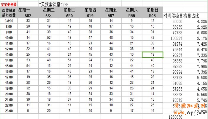 因為每個關鍵詞在每個日期和同一日期的不同時間段的流量是不一樣的,所以在同一個關鍵詞下不同時間段的競爭力也不一樣,我們需要先把一個關鍵詞在不同時間段的競爭力通過數據化分析一個大概出來。如下圖,取的“寶寶坐便器”這個關鍵詞,先是通過數據魔方統計出這個關鍵詞近一個月周一到周日七天不同日期的流量和0-24小時不同時間段的流量占比,比如周一一天“寶寶坐便器”|這個詞星期一大概可以分到的流量是682個,早上8點到九點這個小時通過時間段的流量就是682×2.92%=20個流量,然后回去看上圖,8點到9點這個時間段,有沒有威脅的寶貝安排在這個時間段上上架,如果安排在這個時間段上上架,這個關鍵詞,這個時間段的流量獲取能力參數就是20/1=20.再看10點到11點這個時間段,可以分配到的流量682×8.17%=56個流量,在這個時間段里有3個有威脅的寶貝安排上下架,如果安排在這個時間段上架的話流量獲取參數=56/(3+1)=14.這個流量獲取能力參數不是說你能獲得那么多流量,是指在這個關鍵詞下,你獲取流量能力的高低。這樣我們就可以算出各個時間段上這個關鍵詞下寶貝的流量獲取能力參數。