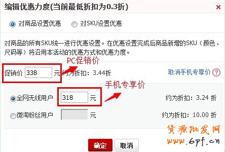 巧設手機專享價:商家在店鋪后臺設置手機專享價,給產品設置手機專享價能獲得手機端搜索加權,寶貝能優先得到展示,而在PC端,寶貝仍然顯示PC端的優惠價,雖然是兩個不同的載體,但價格不會相互干擾。手機專享價不僅是進入手機淘寶的敲門磚,而且還能促發買家消費,有利于提升店鋪轉化率。 設置方法:天貓營銷工具——特價寶,選定產品設置如下。(除了可以設置手機專享價外,當然你還可以選擇微淘粉絲價,但二者只能選其一。)