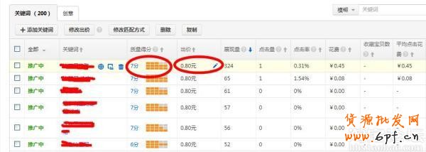 大家看上圖,剛進直通車的小賣家肯定不理解,我的詞已經十分貼切了,為什么質量得分上不去,這是因為我們前期的寶貝轉化率,收藏率等一系列的店鋪內功不足,所以,前期如果一味的設置高價,得不到很好的轉化,質量得分會越來越低,結果不言而喻了,所以出價不要太高,多去優化關鍵詞,強化店鋪寶貝內功,抓住有限的點擊和訪問,慢慢的我們的質量得分會增加,你會發現我們不需要出那么高價了,就可以獲得更多的點擊,這就是俗稱的“養詞”。