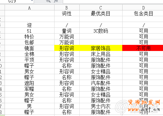 我們看A類:是標(biāo)題拆分后的一個(gè)結(jié)果,B類是詞性,C類是最優(yōu)類目,D類是該寶貝的最優(yōu)類目的包含情況,以上數(shù)據(jù)采集來(lái)自數(shù)據(jù)魔方。
