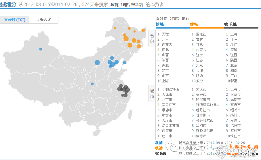 做服裝類的人可能很清楚,秋褲,線褲,棉毛褲這三個(gè)稱呼其實(shí)稱呼的就是同一樣產(chǎn)品。從圖我們可以看出,在東北黑龍江這幾個(gè)地方的人他們的習(xí)慣搜索線褲,而在北京這個(gè)地區(qū)的人習(xí)慣搜索的是秋褲 ,在長(zhǎng)江中下游地區(qū)這幾個(gè)地方的人又更喜歡搜索棉毛褲。