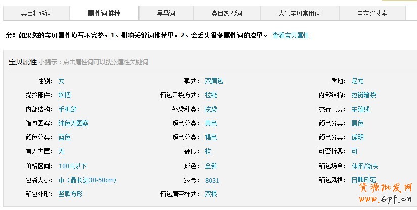 其次,淘寶首頁的類目中點進去看到的寶貝中,有的標題中并沒有包含類目詞,但同樣被展示出來,因為寶貝屬性里有該類目詞。