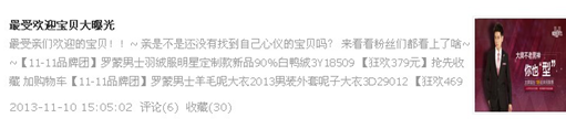 第一條微淘廣播是“最受歡迎寶貝曝光”。當(dāng)天,編輯查看后臺(tái)系統(tǒng)收藏排名,由編輯選出收藏最多的每個(gè)類目的寶貝,并且推薦給粉絲,給雙十一預(yù)熱,一方面增加熱門(mén)產(chǎn)品的曝光,另一反面方便粉絲挑選寶貝,增加吸引力。為雙十一的銷售做好充分準(zhǔn)備。