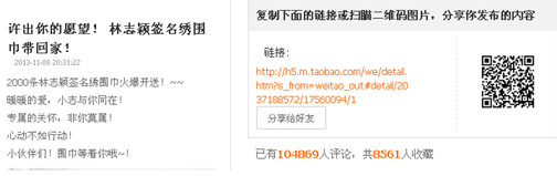 經(jīng)過(guò)前期林志穎的微博預(yù)熱,中期淘寶的熱推,使得羅蒙微淘許愿樹(shù)積累了很好的粉絲基礎(chǔ),該廣播也成為熱門(mén),一個(gè)粉絲表達(dá)愿望的集聚之地并與商家交流的平臺(tái)。此舉很好地加強(qiáng)了顧客與商家的溝通,提高了用戶粘性,為以后的活動(dòng)與銷售做好良好的鋪墊。